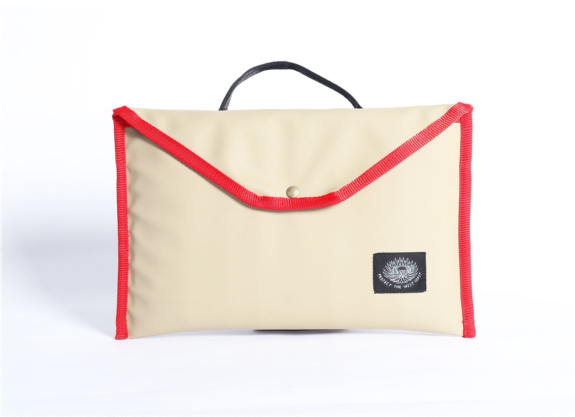 Protect your laptop in style with this sleek computer carrier bag. Crafted from upcycled canvas and lined with repurposed advertising banner material, it offers a snug fit, an outside pocket, padded protection, and a secure button closure. Whether you're heading to the office, a coffee shop or a weekend up the West Coast, this durable sleeve ensures your device stays safe while reducing waste, so you can carry your laptop with confidence and protect the environment at the same time.