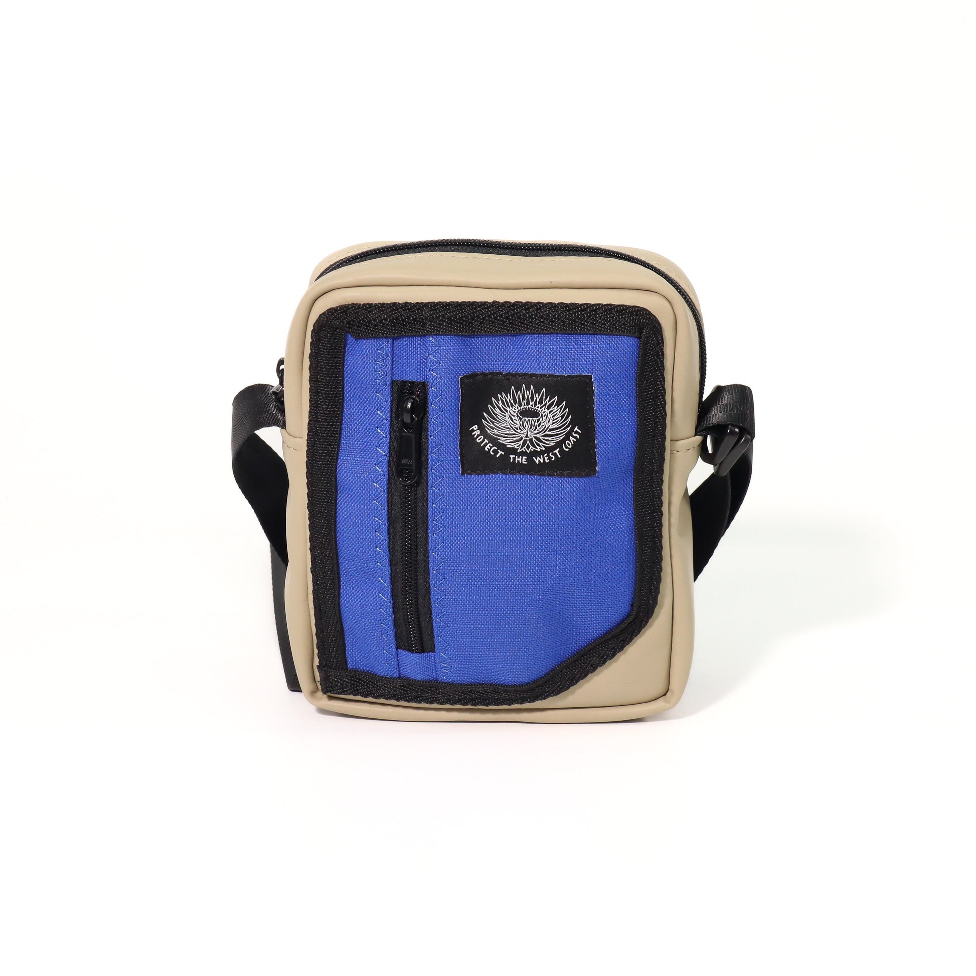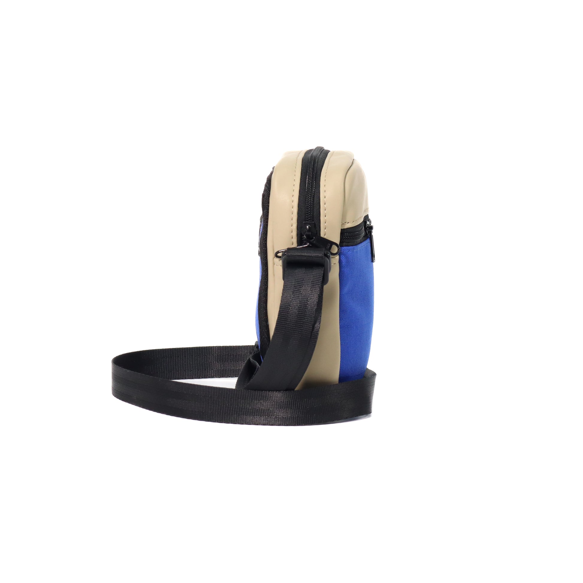 A smaller sized cross body with adjustable webbing strap function. Top edge zip opening, with an internal slip/phone pocket. Front panel patch pocket detail, with vertical zip closure, as well as a back panel zip closure slip pocket.