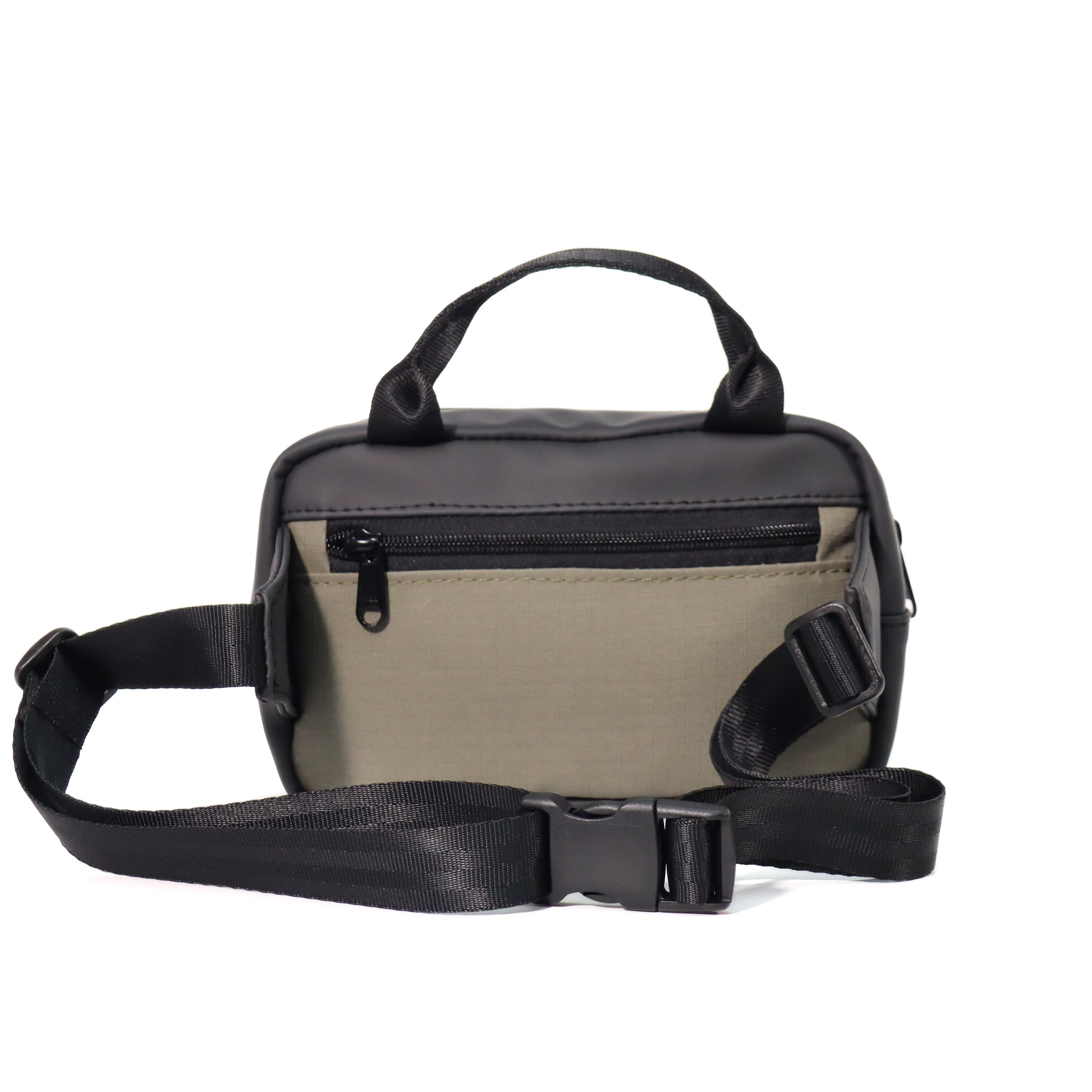 A smaller sized cross body with adjustable webbing strap function and top handle strap. Front zip opening, with an internal slip/phone pocket. The back panel includes a zip slip pocket. Inside lined with repurposed poly twill.